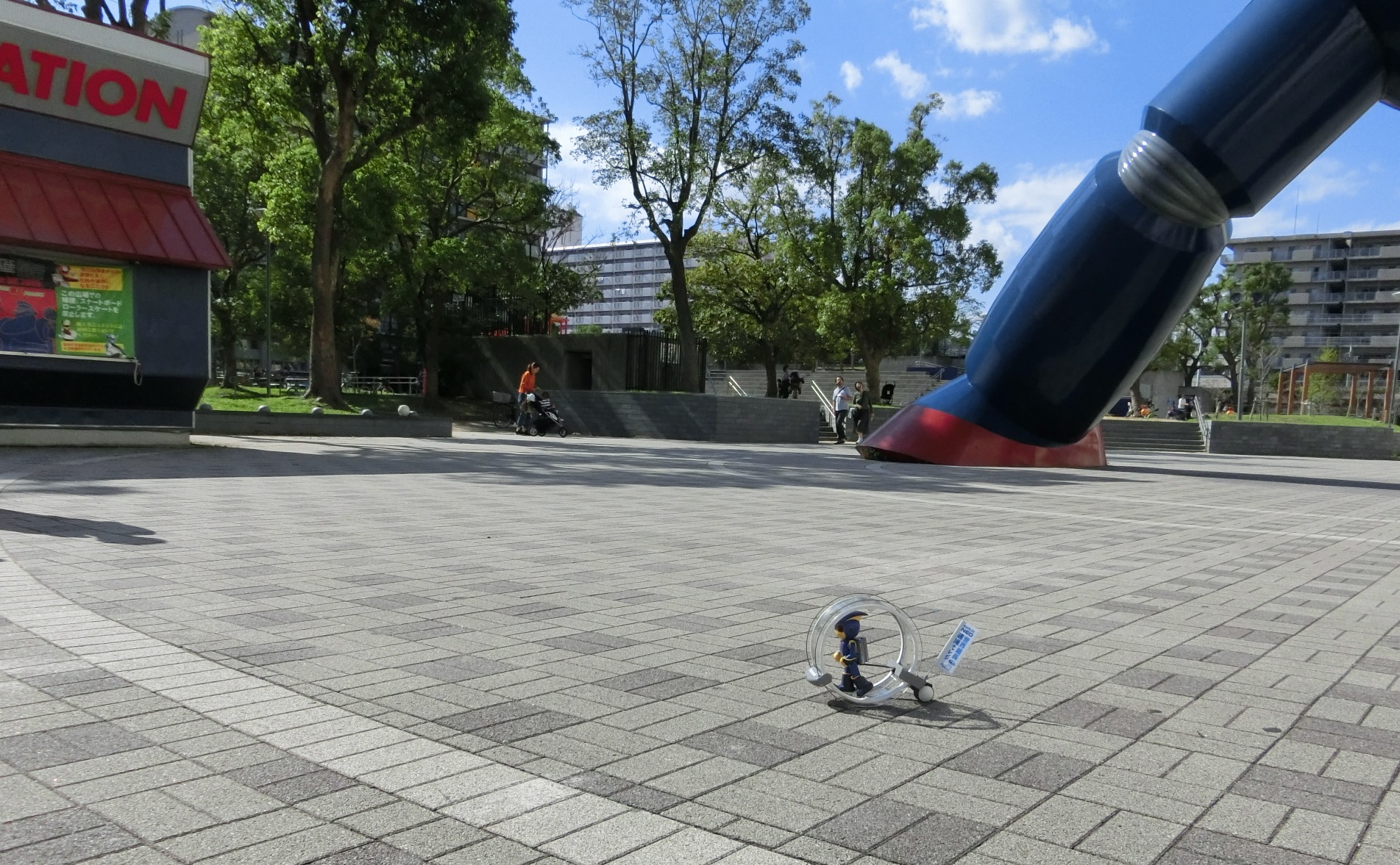 先日、鉄人広場~新長田1番街を走行した パナソニックのミニロボット「エボルタNEOくん」です。 守口市から広島安芸の宮島を目指して歩いています。